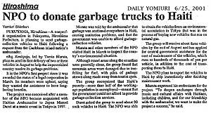 いま私たちは、10月末に行うハイチ人パーカッショニストによるワークショップと、ペチオンビル市へ2台のごみ収集車と二輪車24台を贈るプロジェクトの大詰め段階に入っています。方やニューヨーク、方や通信事情のよくないハイチ、と、やりとりにはなかなか時間がかかりますが、皆、実現へ向けて日々動いています。