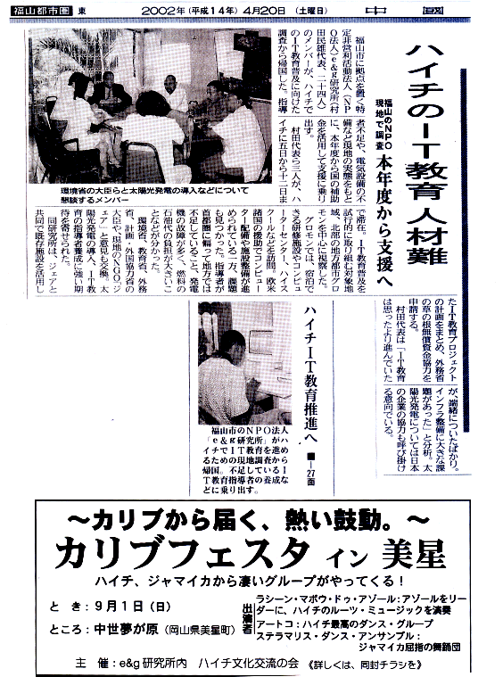 今回の視察参加者は、ハイチ・プロジェクト担当の手島佳子、そして青山修也と村田民雄の3名。電子メールによる事前のやり取りで、日程の概略は了解していたが、視察先がびっしり。憧れのカリブ海でエンジョイする暇はなかった。 ハイチの道路事情は極めて悪い。20km移動するのに1時間30分はかかる。今回の視察先が、首都圏でなく地方であるため、移動時間をたっぷりとみなければならない。国道1号線でも、途中真っ白な砂煙を上げながらの走行となる。 今回のハイチ訪問の目的は、教育現場でのIT活用と識字教育を推進するための調査だったが、もう一つ重要なことは、ハイチでの事業展開で不可欠となるハイチ側NGO・ジェアーとの信頼関係を築くであった。パートナーとなるジェアー代表者のマークさんは、以前福山を訪れていて蔓識があったが、他のメンバーとは初の顔合わせ。誰がメンバーなのかも分からず少々戸惑ったが、一緒に行動する内にすっかりうち解け合い、所期の目的を達成できた。この信頼を基に、現在、IT教育プロジェクトの内容を検討している。 |