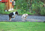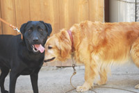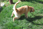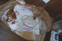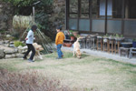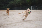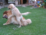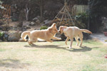 | あいちゃんは元気ハツラツ、やんちゃ盛りで何しても、楽しくてしょうがないと言った感じです。 一方の先輩ゴールデン、チャイは、世間ずれした50過ぎのおばさん。 人間で言ったら、孫を見てる感じだろうか。 若いのが、先輩にちょっかいを出して、時々追いかけられながら、とてもうれしそうでした。 |