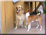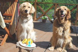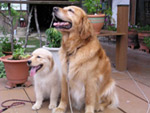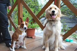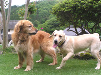 | 我が家には「烏骨鶏」が10羽程いましてその番犬にと思って、知り合いに声をかけていたところやってきたのが、2才の「ゴールデンレトリーバー♀」、番犬にはならないし、大きいしどうしようかと思ったけど顔を見ると可愛いくて、とてもなつくしで我が家の一員になったのが、2002年の5月でした。 と言うことで今年(’11.5月)で11才になります。(名前はCyai,インドのミルクティ、チャイです。) たまにペット連れのお客さんが来ると大喜びです。この日は南アフリカ原産の珍しいワンちゃん(狩猟犬だそうです)が遊びに来てくれ大はしゃぎ。 店内への入店は衛生上のこともありご一緒にはお食事は出来ませんが、テラス席でお食事が出来ます。 花や植木、芝生におしっこはさせないでね!オシッコは駐車場でお願い! リードは必ずしてくださいね。おしっこシートなどもあるといいです。 |