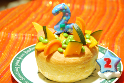 2010/5/12はマサラ2歳の誕生日です。 アッと言うまの2年ですね。 マサラの異母兄弟から、頂いたローソクを飾って、手作りケーキでお祝いをしました。 ケーキの中身は、小麦粉とカボチャのピュレといういたってシンプルなもので、作るのも簡単。 デコレーションは、ボイルした人参、カボチャ、枝豆というヘルシーなケーキ。 ちょっとおすそ分けを貰ったけど、結構、美味しかったですよ。 |