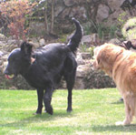 07.4.15 この日、久しぶりに大型犬が遊びに来てくれました。 名前は「NEO」君フラットコーテッド・レトリーバーもうすぐ3才です。 見た目はちょっと怖そうだけど、人が大好きで誰とでもすぐ友達になれる優しい犬種です。毛並みも長い毛が寝ていてとても柔らかく、シルキーな感じがいいです。チャイもとても喜んではしゃいでいました。 |