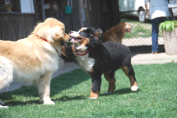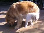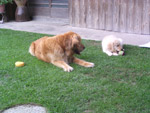 2010/6/15 2歳を過ぎ、随分と落ち着いてきたマサラに、新しいお友達が出来ました。 バーニーズ・マウンテン・ドッグの『ヒュウゴ』君、4ヶ月ですが、すでに体重20kg あるそうです。 マサラと比べても、体の大きさはほとんど変わらない様に見えます。 相手の肩に手をかけるのが好きなようで、始めてそんなことをされたマサラは、ちょっとびっくり。 『何だこいつ、なれなれしいな。』と思ったかどうか。 |