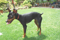 | 広島からドイツ生まれの小型犬、ミニピンの愛称で親しまれてる、『ミニチュア・ピンシャー』がやってきてくれました。 名前は「とと丸」君2歳。 筋肉質で均整の取れた無駄のない体型です。 ドーベルマンを小型化したようなワンで、馬のように前足を高く上げて軽快な歩き方をします。 ドイツではねずみを取ったり、番犬として飼われてるそうです。 |