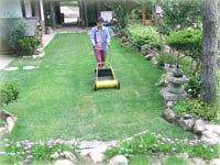 | 04.7.23 約1ヶ月、だいぶ落ち着いてきました。 丸い飛び石はうっとうしいので取っちゃいました。このころになると、2〜3週間に一度位芝刈りをしてます。 芝刈り機は、手押しでリール式にしました。15坪ほどなので30〜40分で刈れます。 刈り高は20mmです。 |