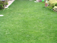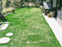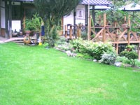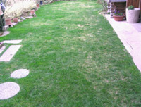 04.9.28 8月上旬に一ケ月も早いオーバーシーディングをして、一ヶ月が過ぎた頃です。 夏の暑さにむれて少し弱った部分もありましたが、ごらんのようにみずみずしい庭になりました。 このあたりは標高も高いので、朝晩涼しいのが幸いしたのかもしれません。 品種は「ペレニアルライグラス ファントム」というサッカー場などにも使われている種を使いました。 |