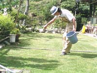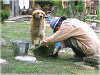 04.6.17 丸石の部分は、カーブに沿ってカマやはさみを使ってカットして張ります。 並べ終わったら、継ぎ目に砂を少し盛っていきます。(継ぎ目のほふく茎が早く伸びるように) また、芝の上にもぱらぱらっと砂をまいて手のひらで払ってやります。 |