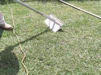 07.9.27 種をまいた後は、代掻きのようなもので種を芝の根元のほうに、すり込んでやります。 種の量は、ペレ1K,ブルーグラス1Kと去年の残り200gで、これらを混ぜたものを手で塩を振るように蒔いています。 種をすり込んだ後は、砂をかけて種を覆ってやり後は、水撒きで完了です。 芝の刈りだかは、10mmです。10mmだと全体が剥げたような感じになってちょっと寂しいです。 |