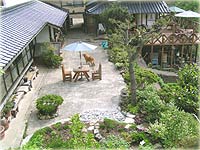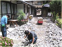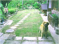 | 04.6.9 何十年ぶりかに目覚めた土は気持ちよさそうに何度も深呼吸をしている見たいでした。愛犬「Cyai]も喜んでます。 芝もいいけど土の庭も素朴で、母屋ともマッチしていました。(母屋は築150年です。) |