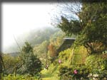 テラスから見た藁葺き小屋、向こうの山は朝靄がかかっていてとても幻想的な朝でした。アジアの原風景を思わせる雰囲気の中で、身も心もリフレッシュ出来る事請け合い!